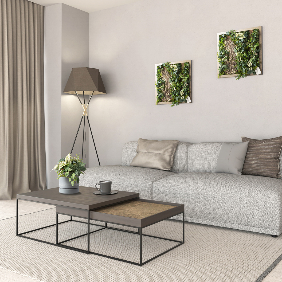 モダンでクールな印象と、ふわっと柔らかく光を纏う優しい雰囲気を宿した、アルミ製の美しいフレーム。その美しさを最大限に引き出す、グリーンとの絶妙な組み合わせと、時間の移ろいとともに変化する影の落ち方まで計算された立体的な構成。存在感がありながら、空間に自然と溶け込むインテリアに仕上がっています。