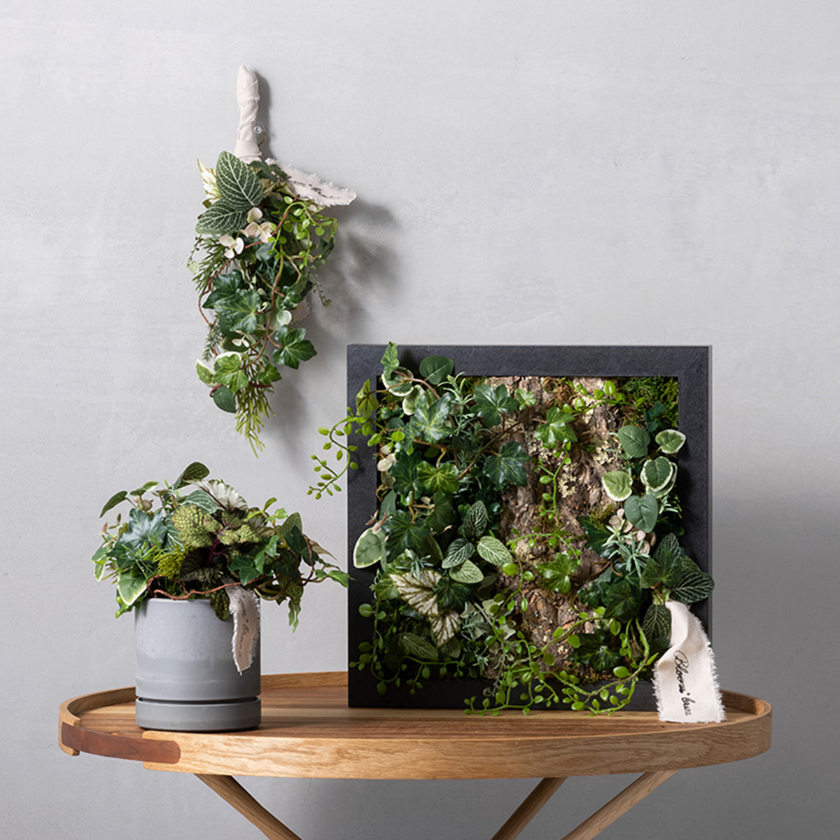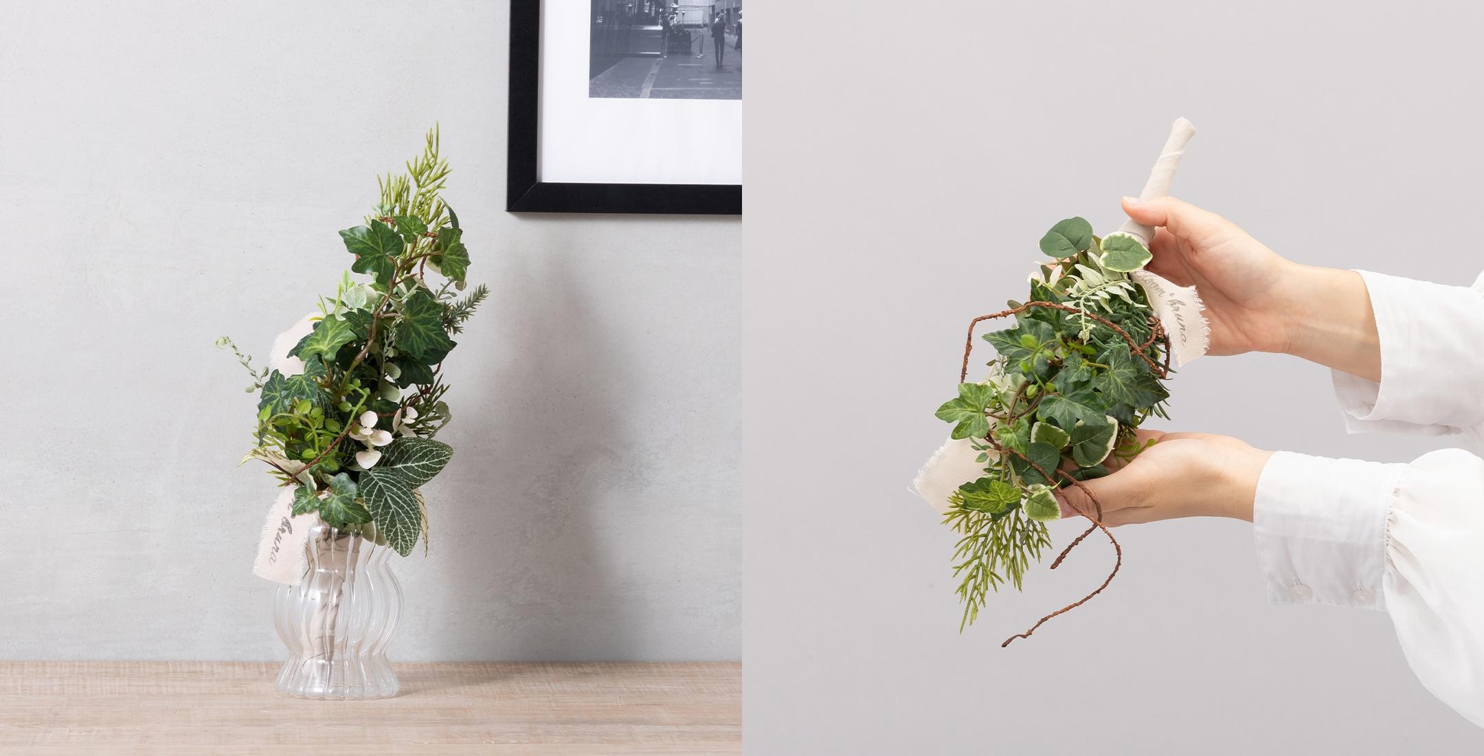 アーティフィシャルグリーンを中心に構成された本商品は、自然が持つ移ろいの美しさを感じさせながら、空間にやさしく寄り添います。
