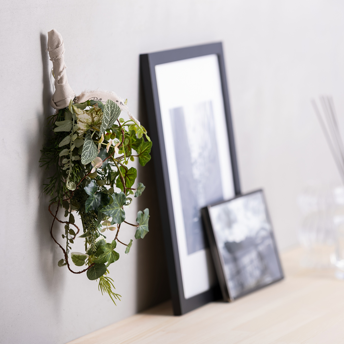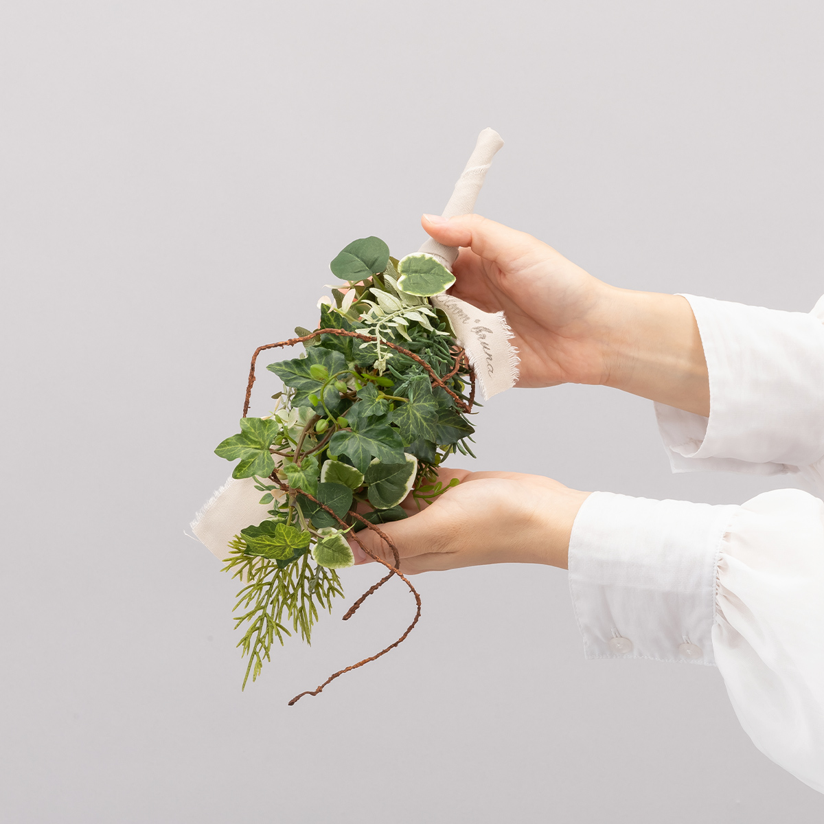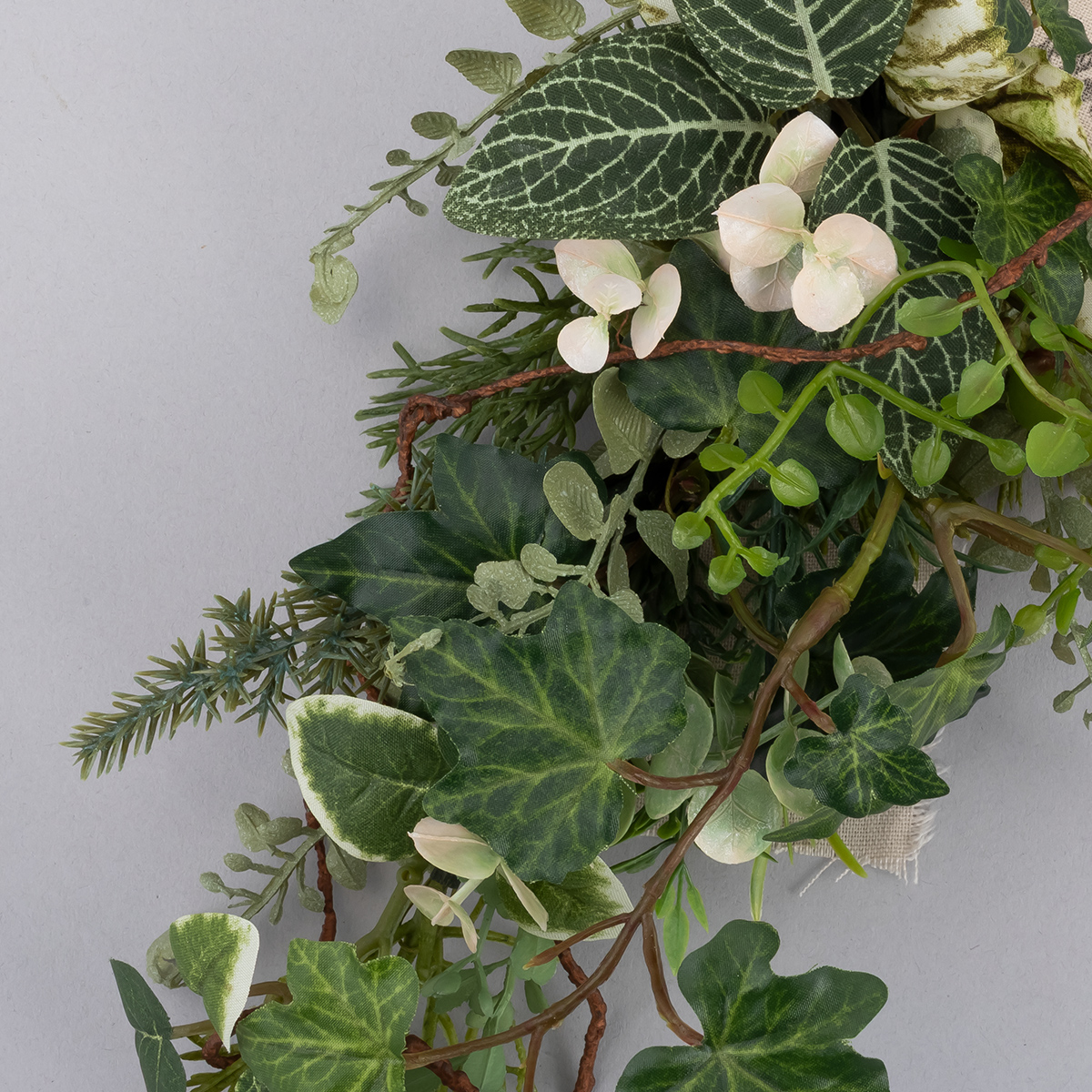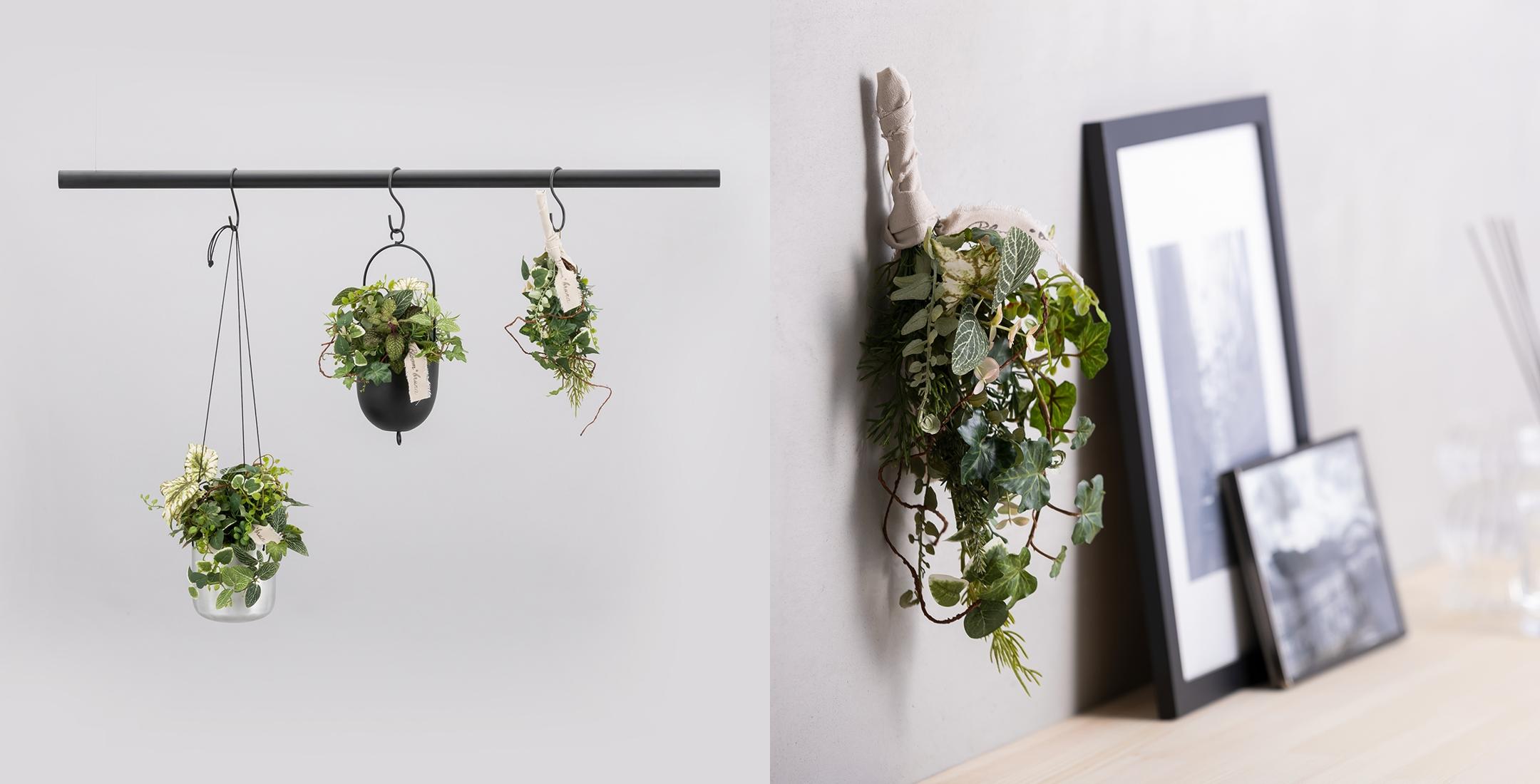 スワッグは曲げたり沿わせたりと自由に動かせる構造になっており、花器や棚、小物などに合わせて立体感を演出できます。
